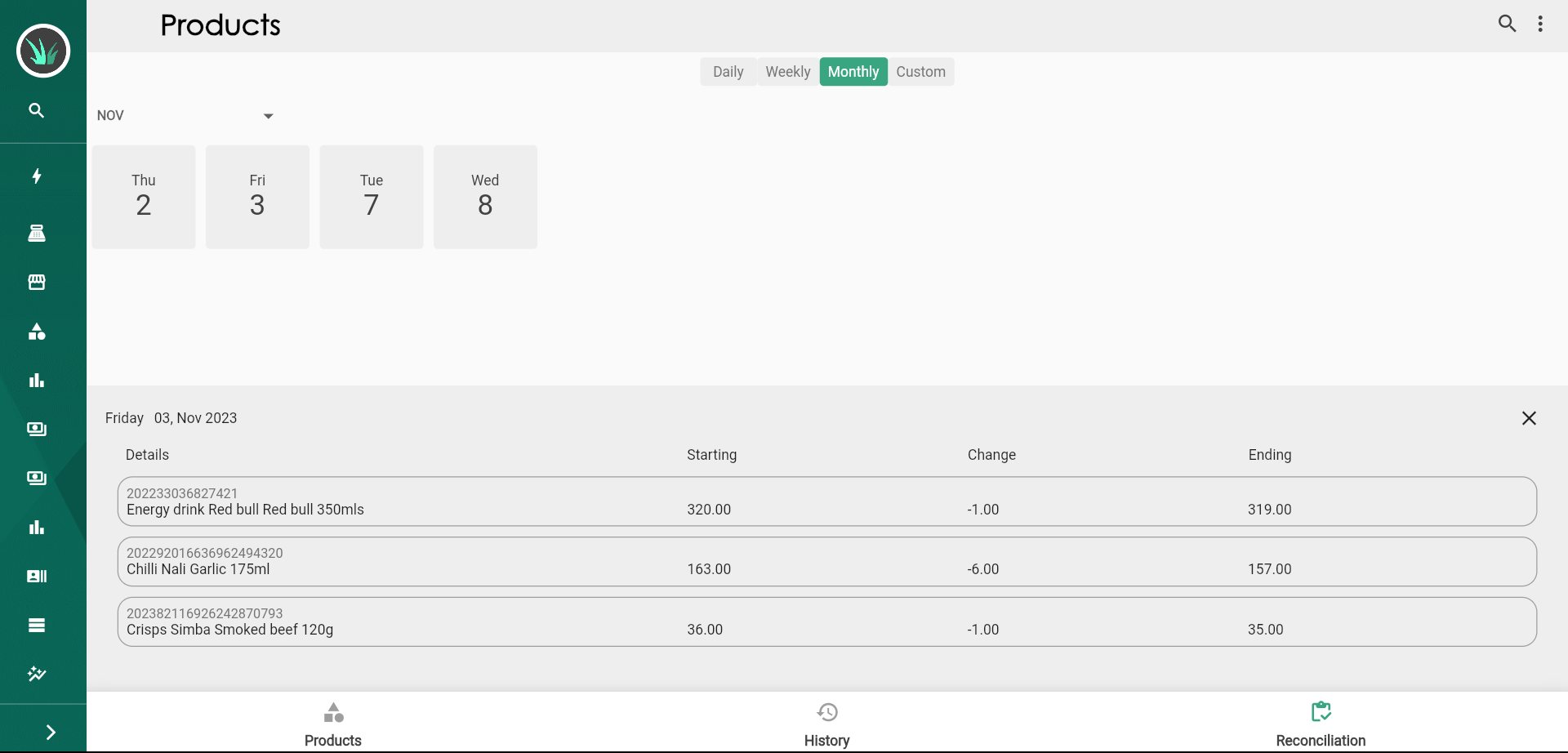 Add your Products and Sevices, Keep track of movements in stock. Do your reconciliations and tracking.
